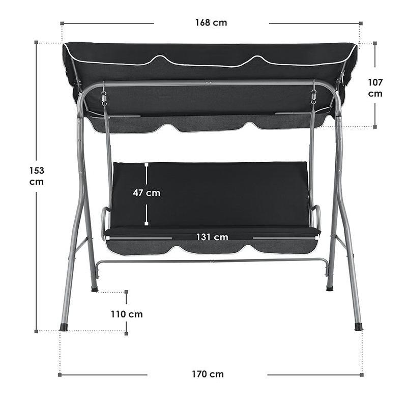 Pohodlná a útulná 3 místa houpačka Hollywood, na které si můžete užít letní počasí a je dokonalým doplňkem pro vaši zahradu, terasu nebo zimní zahradu. Díky nastavitelné sluneční stříšce můžete pohodlně sedět ve stínu i během slunečných dnů. Moderní zahradní houpačka má stabilní rám z oceli s práškovým nástřikem. Práškový lak spolehlivě chrání rám před korozí, nohy ve tvaru h dodávají houpačce dostatečnou stabilitu a nosnost až do 200kg. Prostor k sezení široký 131 cm nabízí pohodlné sezení až pro 3 osoby. Díky 47 cm vysokému opěradlu se můžete pohodlně opřít. Výška sedáku 53 cm usnadňuje vstávání. Střecha 168 x 107 cm z vodoodpudivého polyesteru o tloušťce 160 g/m² lze snadno sklonit pomocí vroubkovaných šroubů. Takže jste vždy spolehlivě chráněni před prudkým sluncem na houpačce. Podložka k sezení o tloušťce 3,5 cm s bavlněnou výplní pokrývá celý povrch sedáku a opěradla a zajišťuje co nejlepší pohodlí při sezení.