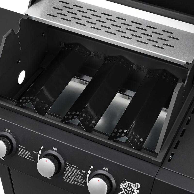 BBQ plynový gril Louisiana se 3 hořáky vás zaručeně okouzlí. Můžete jej použít k přípravě párků, steaků, žeber, ryb nebo zeleniny pro sebe a své hosty. Grilovací vozík je připraven k použití ve velmi krátké době a umožňuje rovnoměrné grilování při konstantních teplotách. Hotové grilované potraviny můžete dočasně skladovat na topném roštu. Optimálně připravené grilované jídlo zůstane teplé a šťavnaté. Součástí dodávky není žádný redukční ventil!