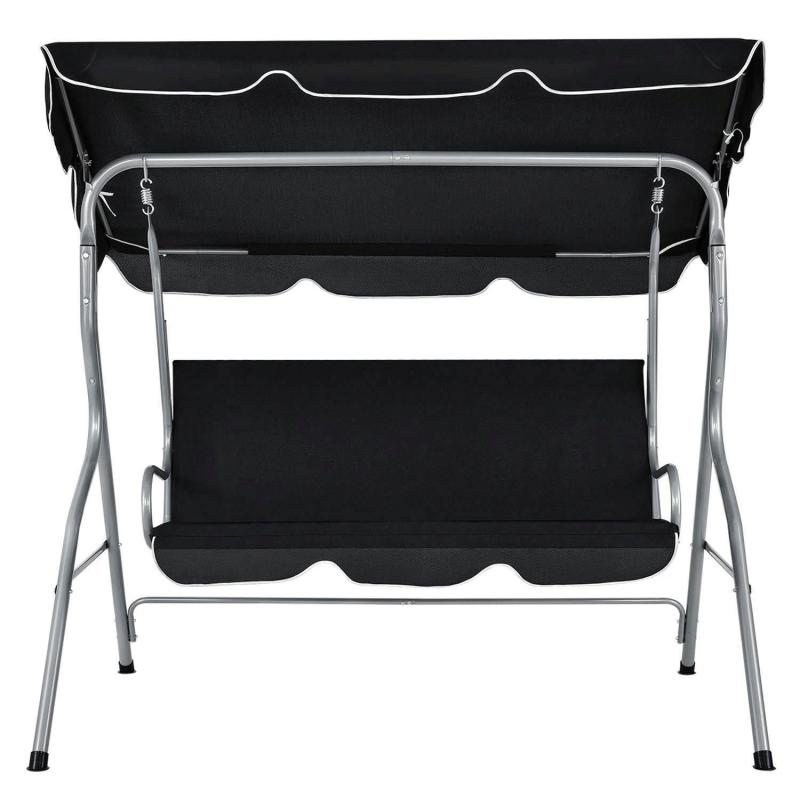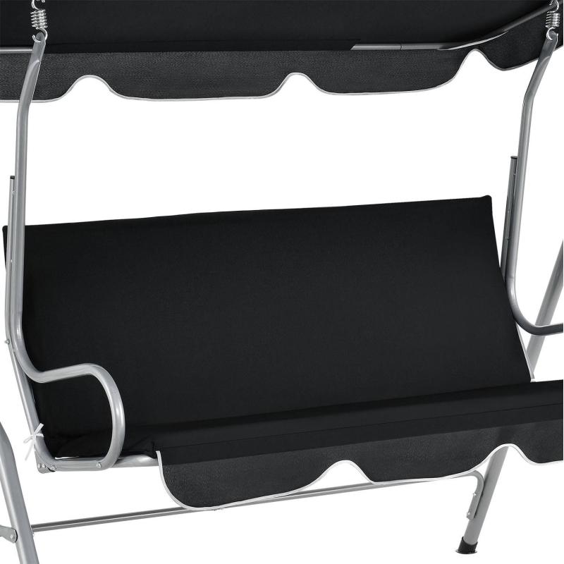 Moderní zahradní houpačka má stabilní rám vyrobený z práškově lakované oceli. Práškové lakování spolehlivě chrání rám před korozí, nárazy a údery. Nohy ve tvaru H dodávají houpačce dodatečnou stabilitu. Protiskluzové nožičky zajišťují bezpečné stání. Houpačka může být zatížena až 200 kg. Sedátko o šířce 131 cm nabízí pohodlné sezení až pro 3 osoby. Díky zádové opěrce vysoké 47 cm se můžete pohodlně opřít. Výška sedáku 53 cm umožňuje pohodlné vstávání. Stříška o rozměrech 168 x 107 cm z vodoodpudivého polyesteru o tloušťce 160 g/m² lze snadno nastavit pomocí rýhovaných šroubů. Střecha tak poskytuje příjemný stín. Potah na sedák o tloušťce 3,5 cm s bavlněnou výplní pokrývá celou oblast sedáku a zad a zajišťuje maximální komfort při sezení. Podložka je odnímatelná a lze ji složit, aby se ušetřilo místo.